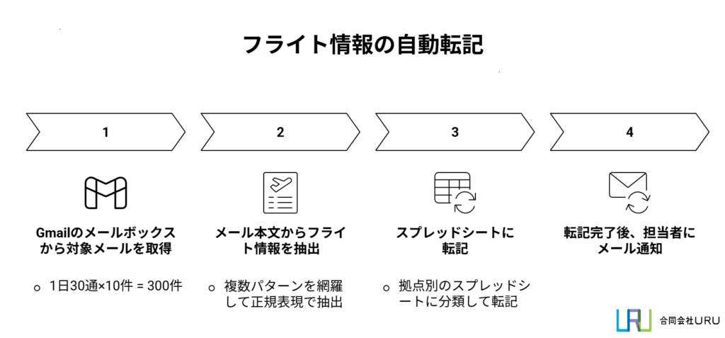 メールで届く1日300件超(30通×10件/通)のフライト情報を、スプレッドシートに転記する業務です。