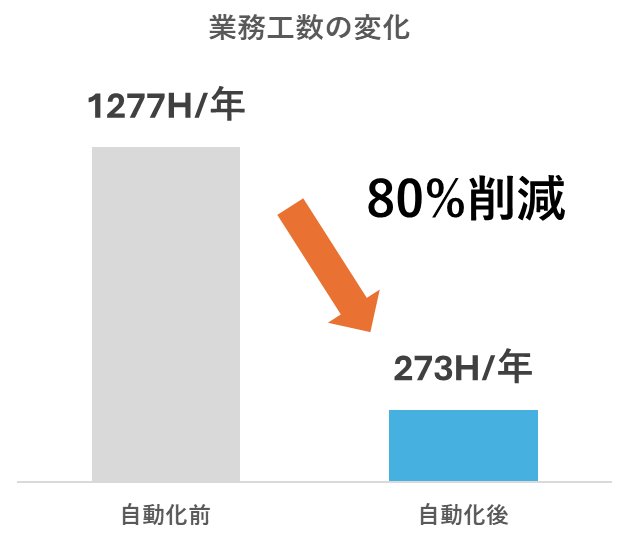 - 削減時間:年間1,004時間(1日3-4時間→45分に短縮し、工数を80%削減)