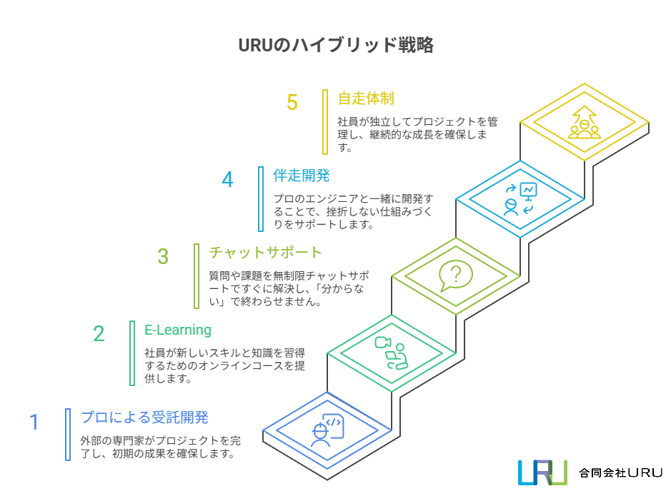 URUでは、プロによる受託開発と段階的な内製化支援をセットで提供しています。外注で確実に成果を出しながら、E-Learning、チャットサポート、伴走開発を通じて社内メンバーを育成し、最終的に自走できる体制へ移行する出口戦略まで設計します。開発と教育の両方に対応できるパートナーは多くありません。